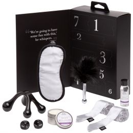 Settet inneholder syv herlige produkter til par og er innpakket i en stilig eske som skjuler produktene bak luker. Åpne en ny luke hver dag i én uke og kom nærmere hverandre når dere utlever deres hete Fifty Shades-fantasier.