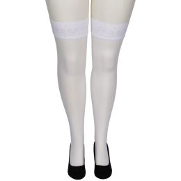 Fra føtter til lår pakker de hvite strømpene inn bena dine i glatt og elastisk materiale. Den tykke og elastiske blondekanten holder strømpene godt på plass under bruk, med eller uten hofteholdere.