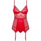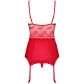 Settet inneholder en chemise i en rød, myk og lett gjennomsiktig som gir et diskret innsyn. De røde blondene pryder bh-skålene under brystet og løper langs den nederste kanten som komplimenterer formene dine ytterligere.