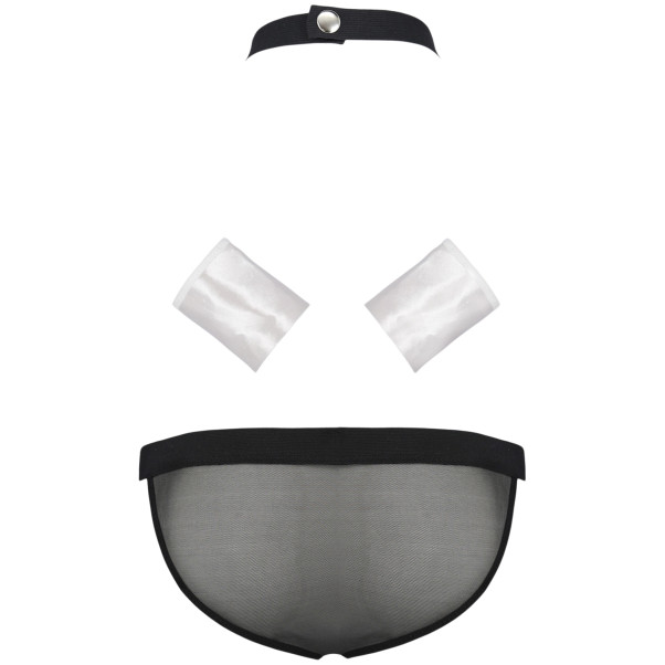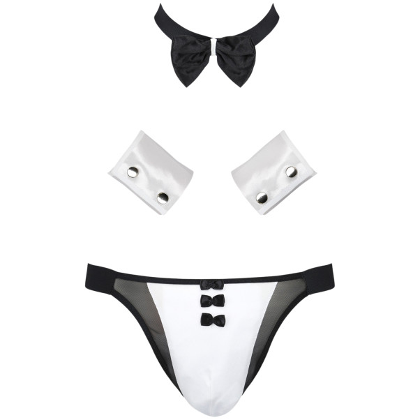 Pass på behovene til din kjære mens du har på deg den svarte kragen, de hvite mansjettene og det trekantede undertøyet som stål i stil til tjenestene du utfører. Gjør jobben din godt, så vil partneren din kanskje finne veien frem ved hjelp av sløyfene på bulen din for å takke deg for tjenesten.