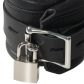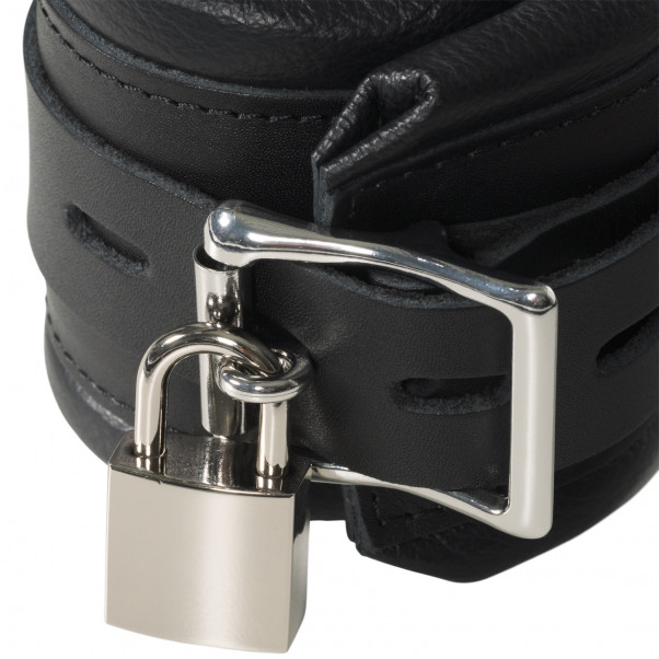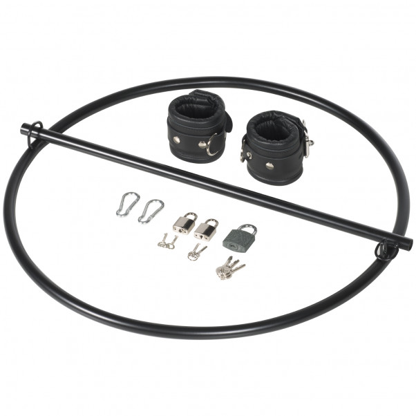 Halve ringen plasseres på korsryggen, mens den andre halvdelen plasseres på baksiden av lårene med barren lukket i midten foran på skrittet med en hengelås. Bruk håndjernene til å binde hendene fast til din sexy sub og nyt!